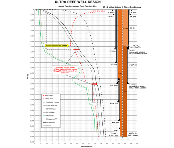 Ultradeep Dual Gradient Drilling (DGD) reshapes the downhole pressure profile to fit PP/FG, cutting casing requirements and preserving large bores. A DG well can reduce casing from eight to four strings and maintain a ~12¼″ hole at TD (vs ~6″ with SG). Lower ECD (<0.5 ppg vs >1.0 ppg in SG) minimizes losses and improves hole cleaning, while fewer casing/cementing cycles shorten well construction timelines by up to 50% and cut total costs by 30–50%.