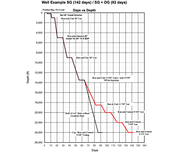 Optimized Dual Gradient Drilling (DGD) reduces casing strings, preserves larger hole diameters, and eliminates flat time from repeated casing and cementing. The result: wells drilled in half the time, at half the cost.